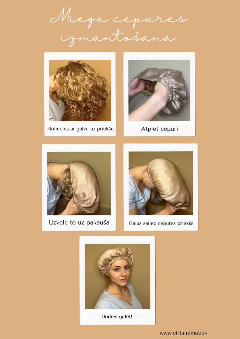 Usage: Before going to sleep, put on the bonnet as shown in the instructions.